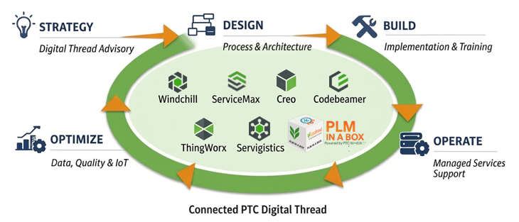 Our Business Advisory service defines an outcomes driven PTC Digital Thread strategy aligned to business goals, product complexity, and operational maturity. We assess processes, systems, and data flows across Windchill, Codebeamer, MCAD/ECAD, SLM, and IIoT to identify gaps, risks, and high value opportunities. The result is a pragmatic roadmap that prioritizes initiatives, clarifies integration touchpoints, and improves efficiency, traceability, compliance, and time to market.